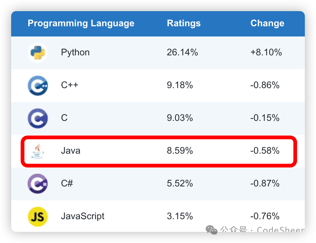TIOBE编程社区相信大家都听过,这是一个查看各种编程语言流行程度和趋势的社区,每个月都有榜单更新,每年也会有年度榜单和总结出炉。昨晚在家整理浏览器收藏夹时,才想起了TIOBE社区,于是打开看了一眼最近的TIOBE编程语言社区指数。没想到,Java居然已经跌出前三了,并且和第一名Python的差距也进一步拉开到了近18...