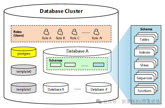 PostgreSQL的逻辑结构PostgreSQL的逻辑结构采用层级式设计,从高到低依次为:数据库集群→数据库(Database)→模式(Schema)→数据库对象(表/视图/函数等),其中多个数据库可以共享同一实例但它们之间相互隔离,模式作为命名空间管理对象,用户和角色全局统一管理权限。数据库(Database)...