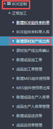 点晴ERP-BOE原材发产线出库流程1.进入ERP系统之后,在左侧功能菜单里找到“BOE定制”,点击“正常加工”,找到“新增原材发产线出库”。