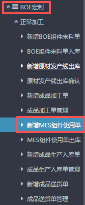 1.进入ERP系统之后,在左侧功能菜单里找到“BOE定制”,点开后点击“正常加工”,找到“新增MES组件使用单”。