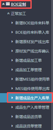 进入ERP系统之后,在左侧的功能菜单里找到“BOE定制”,点开“正常加工”,点击“新增成品加工单”。
