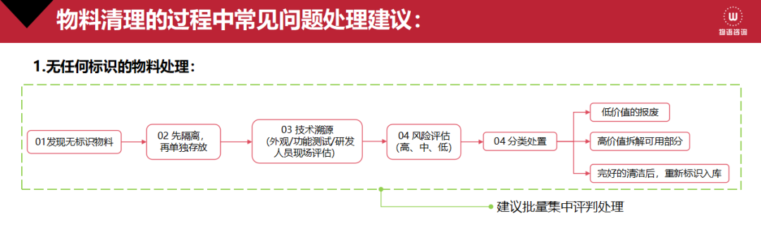 中小企业的仓管人员在对呆滞物料盘点清理过程中,会遇到无任何标识的物料(俗称“黑户物料”)的难题,今天重点谈谈如何该如何处理此类物料。处理此类物料,我们需要建立一套处理流程(机制),能快速对物料进行识别及安全处理,以规避后期的误用及资源的浪费。以下是处理步骤、工具及行业示例:一、标准化处理流程:二、具体操作步骤及示例:...