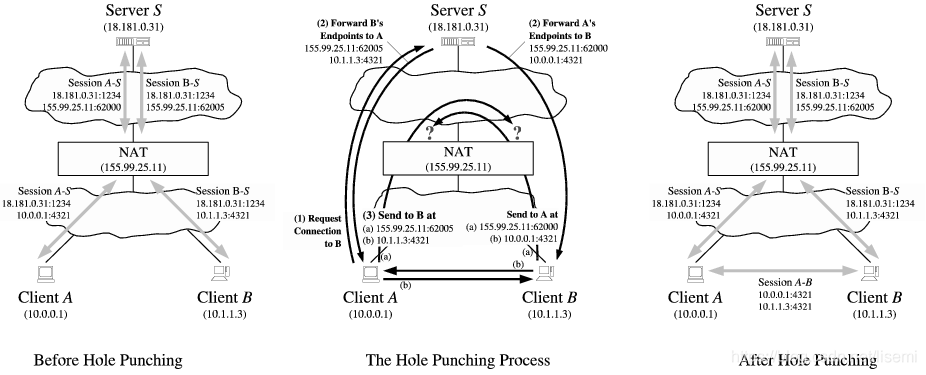 - 同理,B给A公网地址方法的第一个消息也会在B的NAT上“打洞”来为地址(10.1.1.3:4321, 155.99.25.11:62000)建立回话。