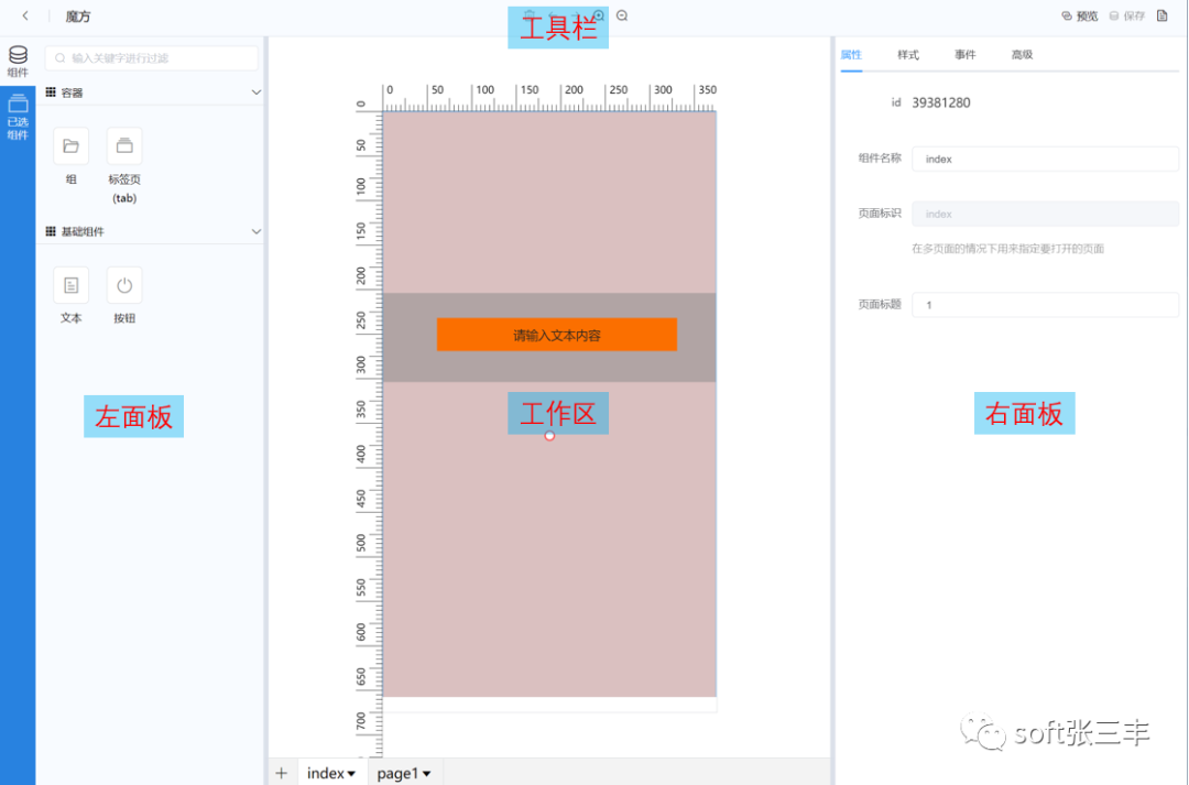 编辑器基础布局上分为:左面板、工作区、右面板、工具栏,如下图。