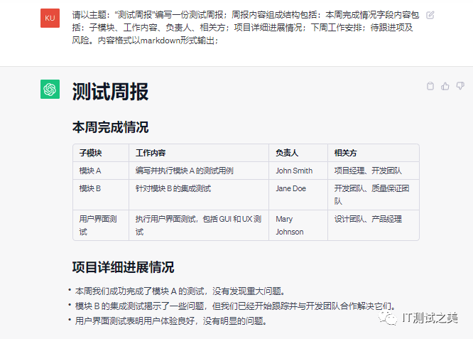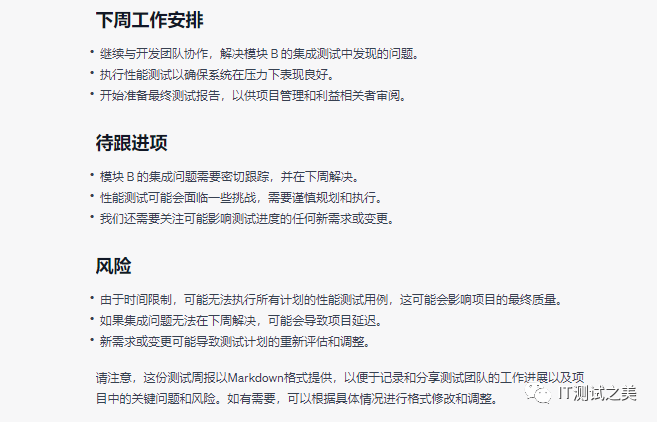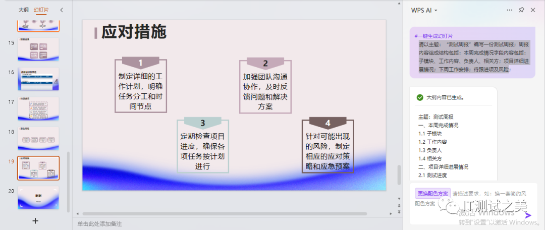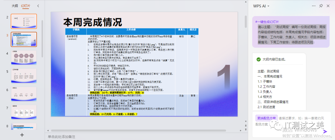 咱先来做一个案例,同样让ChatGPT根据主题输出一份测试周报内容。周报内容组成结构包括:本周完成情况字段内容包括:子模块、工作内容、负责人、相关方;项目详细进展情况;下周工作安排;待跟进项及风险。大概1-2分钟内,自动将测试周报的PPT生成啦,合计20页PPT。别急,可根据需求情况对周报的模板、样式、图片或内容进行调整,最终输出一份心仪的PPT演示文稿。