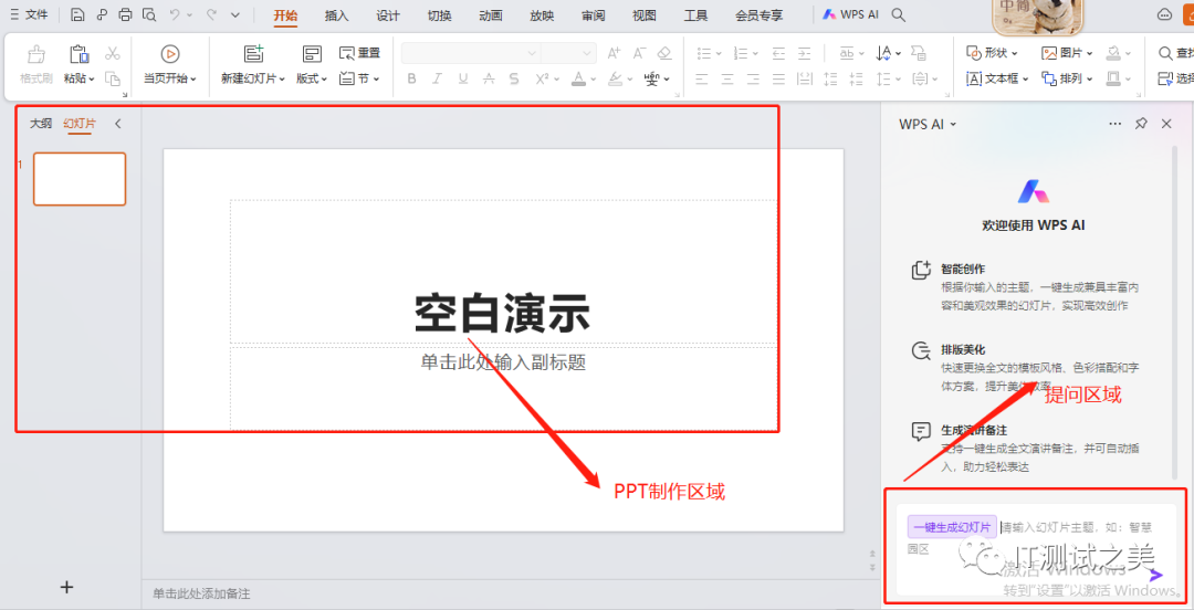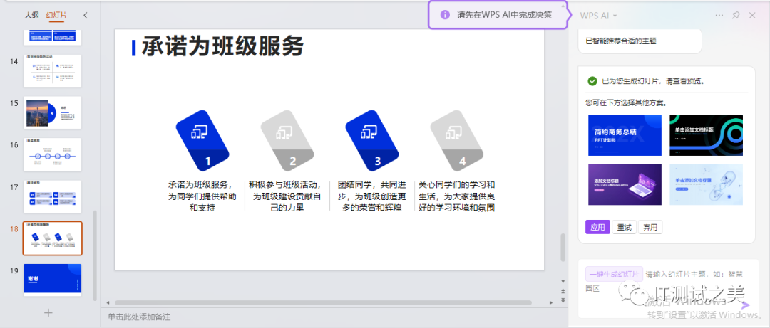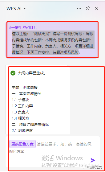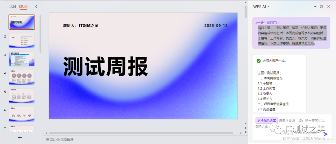 写东西只要肚里有货,直接根据大纲内容梳理输出即可。自从用了WPS AI机器人之后,PPT制作1分钟可搞定。WPS AI 是由金山公司开发的,主要为大家在办公自动化方面助力。例如:Word文档、Excel表格、PPT演示文稿、PDF文件生成及各类智能在线文档,可借助WPS AI自动生成。上面的内容中已重点讲解我们使用WPS AI完成测试周报的编写。
