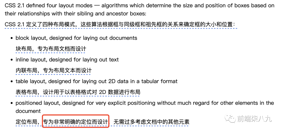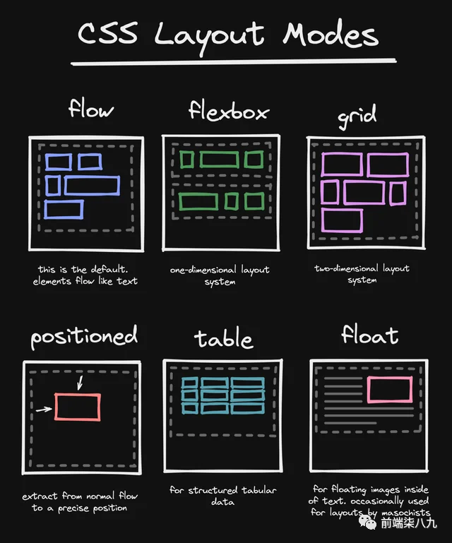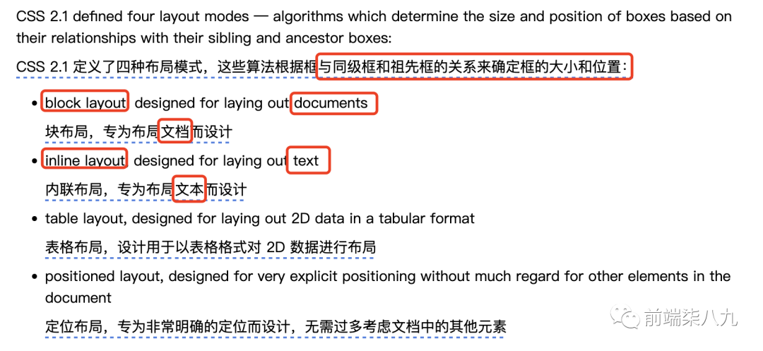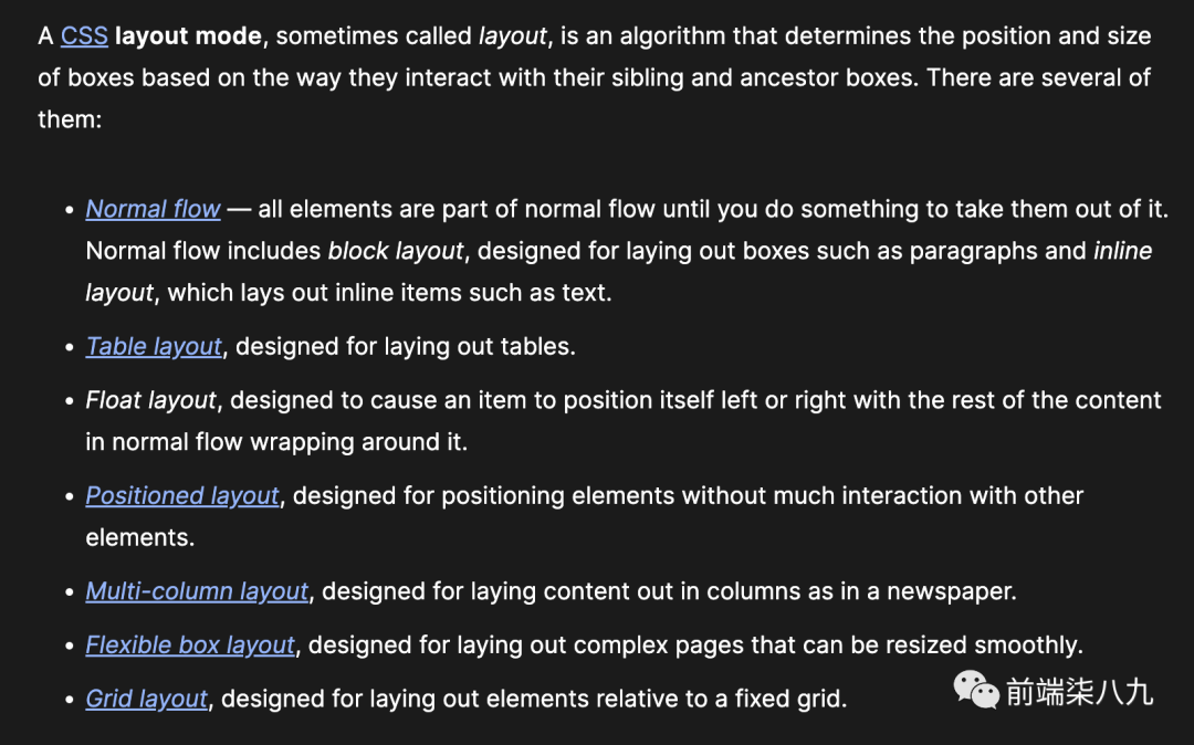 CSS 有不同的模式,确定它如何在页面上布局元素。这些模式通常被称为布局算法或布局模式。