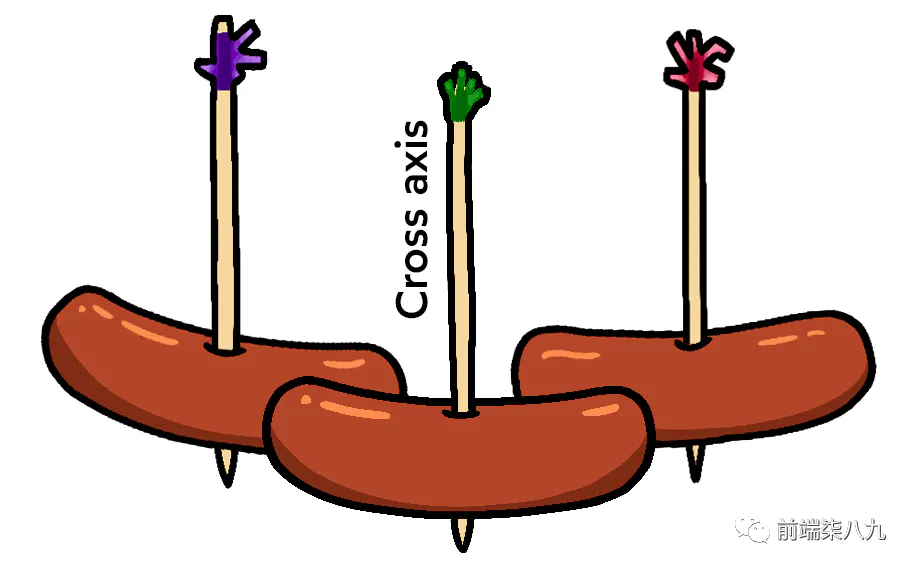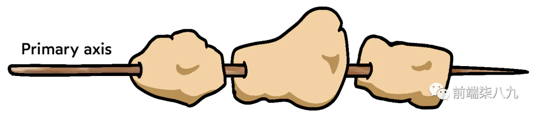 在 Flexbox 中,项目沿着主轴分布。「默认情况下,它们很好地排列在一起,侧边相邻」。我可以画一条直线,将所有子元素串起来,就像烤肉一样: