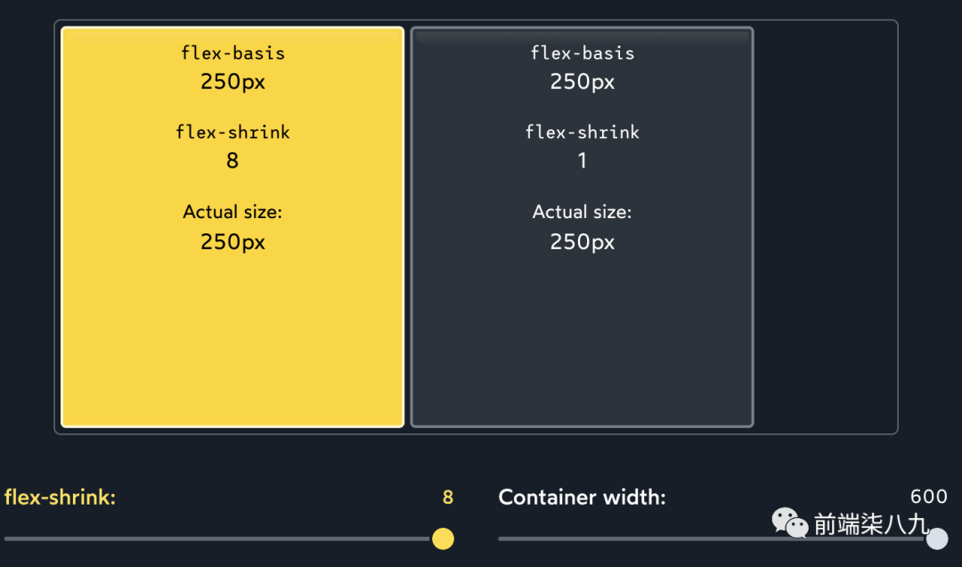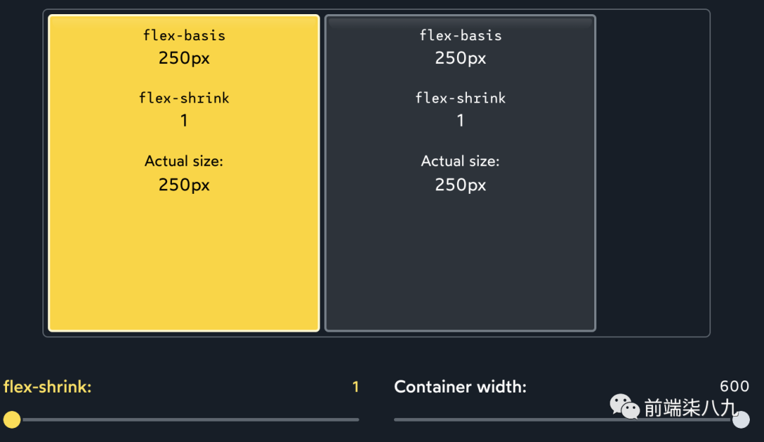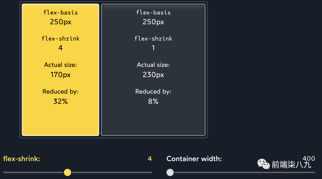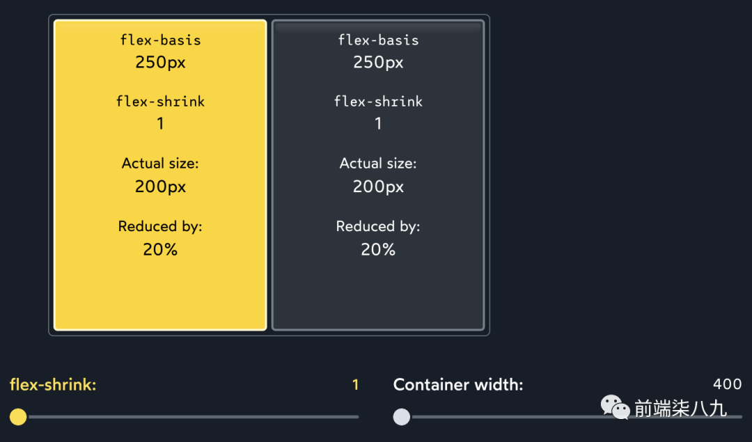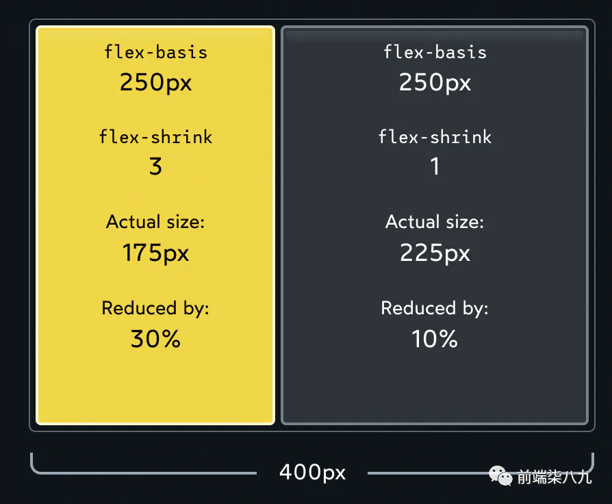 ?「绝对值并不重要,一切都取决于比例」。如果两个子元素都具有flex-shrink: 1,每个子元素将支付总亏空的 1/2。如果两个子元素都增加到flex-shrink: 1000,每个子元素将支付总亏空的 1000/2000。无论如何,最终效果都是相同的。