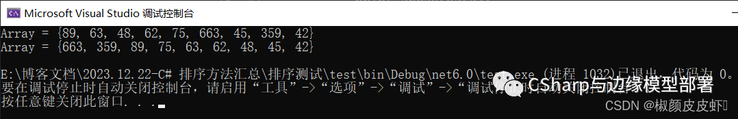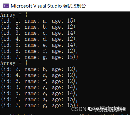 在上面这段代码中,我们主要是使用了Lambda表达式创建了一个委托函数,在这个委托函数里,我们按照排序要求,对其进行了定义,主要是对返回值的条件进行了定义,最后排序结果输出为: