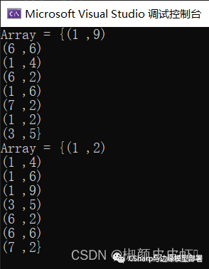 在实际应用中,我们可能还会使用到多维数据,例如对于二维数据,我们在排序时可能会按照第二维数据的第一个数据作为主要排序关键字,第二数据作为第二个关键字进行排序,当遇到这种情况时,我们可以直接使用LINQ语句进行排序,如下面代码所示,我们定义了一个二维数组,类似于将一系列点数据存放到数组中,然后我们可以参考上文中自定义数据排序方法,书写排序代码: