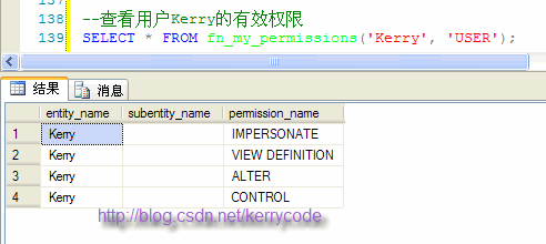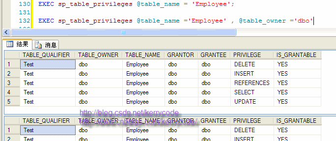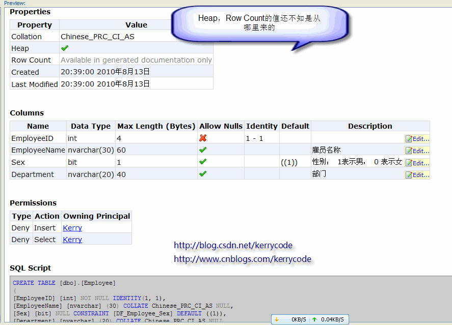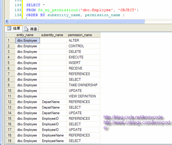 修改脚本如下所示 代码 SELECT C.Name AS FieldName, CASE WHEN T.Name ='nvarchar' THEN T.name +'(' + CAST(C.max_length/2 AS VARCHAR) +')' ELSE T.name END AS DataType, CASE WHEN C.Max_Length = -1 THEN 'Max' ELSE CAST(C.Max_Length AS VARCHAR) END AS Max_Length, CASE WHEN C.is_nullable = 0 THEN '×' ELSE '√' END AS Is_Nullable, ISNULL(CAST(I.seed_value AS VARCHAR) + '-' + CAST(I.increment_value AS VARCHAR), '') AS is_identity, ISNULL(M.text, '') AS DefaultValue, ISNULL(P.value, '') AS FieldComment FROM sys.columns C INNER JOIN sys.types T ON C.system_type_id = T.user_type_id LEFT JOIN dbo.syscomments M ON M.id = C.default_object_id LEFT JOIN sys.extended_properties P ON P.major_id = C.object_id AND C.column_id = P.minor_id LEFT JOIN sys.identity_columns I ON I.column_id= C.column_id AND C.object_id = I.object_id WHERE C.[object_id] = OBJECT_ID('dbo.Employee') ORDER BY C.Column_Id ASC 接下来看看Perssion信息来自何处。 首先我们来看看赋与、收回权限的脚本(我是在sa账号下运行的) 代码 DENY SELECT ON [dbo].[Employee] TO [Kerry] GO GO DENY DELETE ON [dbo].[Employee] TO [Kerry] GO REVOKE DELETE ON [dbo].[Employee] TO [Kerry] GO REVOKE SELECT ON [dbo].[Employee] TO [Kerry] GO 那么这些权限信息保存在那个系统表或系统视图中,我查了很多资料,还是没有查到,呵呵,希望有知道的告诉一声。但是可以同过系统函数和系统存储过程得到一些相关的权限设置信息。 1:系统存储过程 sp_table_privileges, 它返回指定的一个或多个表的表权限(如 INSERT、DELETE、UPDATE、SELECT、REFERENCES)的列表,表具体参见(MSDN)。 2:系统函数 fn_my_permissions 返回有效授予主体对安全对象的权限的列表,表具体参见(MSDN) EXEC sp_table_privileges @table_name = 'Employee'; EXEC sp_table_privileges @table_name ='Employee' , @table_owner ='dbo'