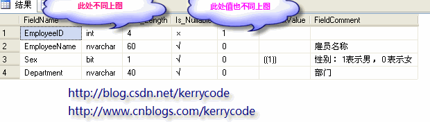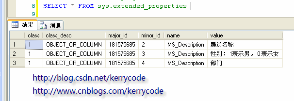 用SQL Doc生成数据库字典文档的时候,突然发现有字段描叙(Description)这项内容,以前一直没有注意过,故特意研究了一下,结果越挖越深,就写了这篇文章。 以前在做数据库脚本开发时,新建表时,对各个字段的描叙要么是记录在文档里面,要么自己建一个表,来保存这些内容,以便日后开发、维护的方便。其实这些信息完全可以放在数据库自己的系统视图里面。 对字段的说明、描述一般都放在系统视图sys.extended_properties中,例如(表dbo.Employee的字段Department的说明) SELECT * FROM dbo.Employee SELECT * FROM sys.extended_properties 其中 当class =1时,major_id它的值是dbo.Employee的id,minor_id是Department的id(详细信息参见MSDN),如下图所示