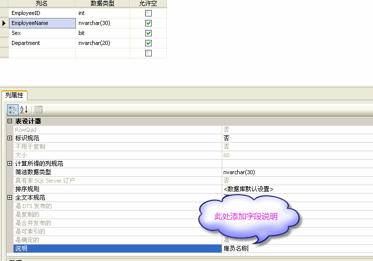当然你也可以用脚本命令添加数据库表的字段说明 EXEC sp_addextendedproperty N'MS_Description', N'雇员名称', 'SCHEMA', N'dbo', 'TABLE', N'Employee', 'COLUMN', N'EmployeeName' 如果已经存在刚才记录,你再执行上面这段脚本,就会提示: 消息 15233,级别 16,状态 1,过程 sp_addextendedproperty,第 38 行 无法添加属性。'dbo.Employee.EmployeeName' 已存在属性 'MS_Description'。 下面看看工具生成的文档,工具生成这些信息肯定是数据库里存有对象的这些信息,下面我们来看看这些信息都是从何而来吧 ![]() 这里先列举一些保存表信息的系统表、视图吧,可能有些遗漏了,实在太多了,要仔细把这些全部列举出来还得花费一番功夫 代码 SELECT * FROM sys.columns --为每个表和视图中的每列返回一行,并为数据库中的存储过程的每个参数返回一行。 SELECT * FROM syscolumns --每个表对象的信息 SELECT * FROM sys.tables SELECT * FROM sysobjects --在数据库中创建的每个用户定义的架构范围内的对象的信息 SELECT * FROM sys.objects --数据库实例中的每个数据库的信息 SELECT * FROM sys.databases --系统数据类型 SELECT * FROM sys.types --含数据库中每个视图、规则、默认值、触发器、CHECK 约束、DEFAULT 约束和存储过程的项 SELECT * FROM dbo.syscomments --保存表的自增列信息 SELECT * FROM sys.identity_columns 下面来看看属性那栏的信息保存在那些表里面。如果表是数据库的默认排序规则,就可以用下面脚本。 代码 SELECT create_date AS Created , modify_date AS Last Modified, ( SELECT collation_name FROM sys.databases WHERE name = 'MyAssistant' ) AS collation_name FROM SYS.tables WHERE NAME = 'Employee' 如果用某个列的排序规则可用下面的脚本 代码 SELECT create_date AS Created, modify_date AS Last Modified, ( SELECT DISTINCT collation FROM syscolumns WHERE id = OBJECT_ID(N'dbo.Employee') AND collation IS NOT NULL AND name ='EmployeeName' ) AS collation_name FROM sys.tables WHERE NAME = 'Employee' 查看数据库的排序规则可以从 sys.databases查看,而表的某个列的排序规则信息保存在syscolumns里面。上图的Heap, Row Count信息我还不知是从哪里来的。 接下来看看Cloumns信息吧 代码 SELECT C.Name AS FieldName, T.Name AS DataType, CASE WHEN C.Max_Length = -1 THEN 'Max' ELSE CAST(C.Max_Length AS VARCHAR) END AS Max_Length, CASE WHEN C.is_nullable = 0 THEN '×' ELSE '√' END AS Is_Nullable, C.is_identity, ISNULL(M.text, '') AS DefaultValue, ISNULL(P.value, '') AS FieldComment FROM sys.columns C INNER JOIN sys.types T ON C.system_type_id = T.user_type_id LEFT JOIN dbo.syscomments M ON M.id = C.default_object_id LEFT JOIN sys.extended_properties P ON P.major_id = C.object_id AND C.column_id = P.minor_id WHERE C.[object_id] = OBJECT_ID('dbo.Employee') ORDER BY C.Column_Id ASC 如图所示,得到结果与文档还是有些区别,我通过该脚本实现与文档一致的时候,怎么也找不到nvarchar(30)的30,这个值的出处,后来才发现它其实就是nvarchar的max_length 的一半。