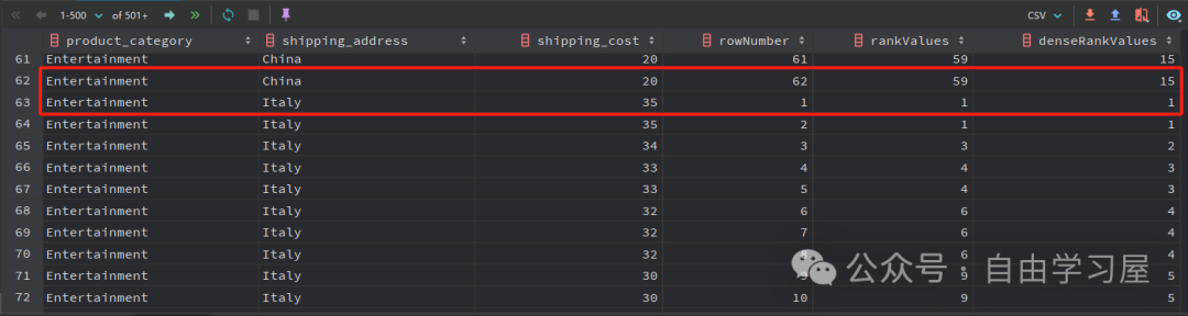RANK() 函数根据 ORDER BY 子句的条件检索排名行。可以看到,前五行之间存在并列,即前五行在 Shipping_Cost 列(在 ORDER BY 子句中提到的列)中的值相同。
