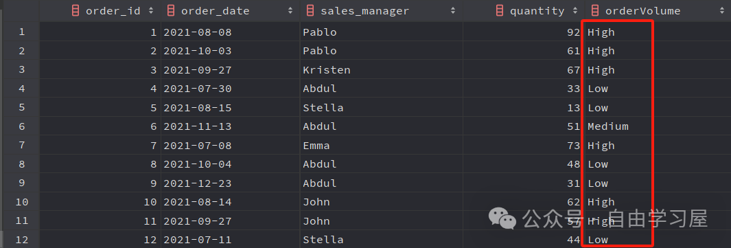 简单地说,它创建了一个新列 OrderVolume,并根据 Quantity 列中的值添加了‘High’(高)、‘Low’(低)、‘Medium’(中)等值。