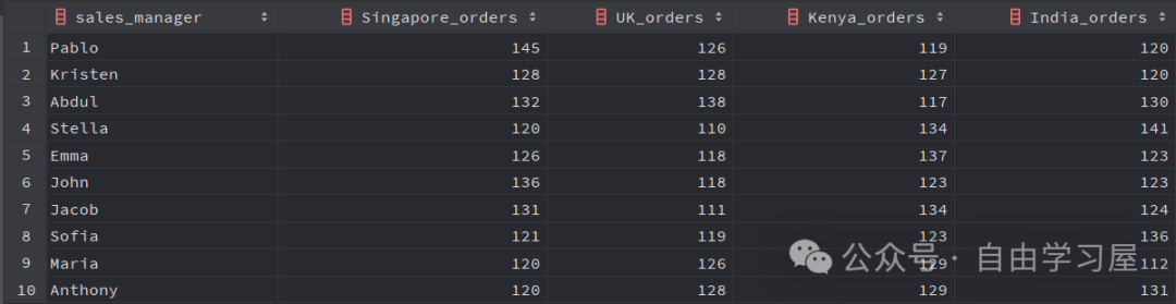 例如,让我们找出每个销售经理在新加坡、英国、肯尼亚和印度处理的订单量: