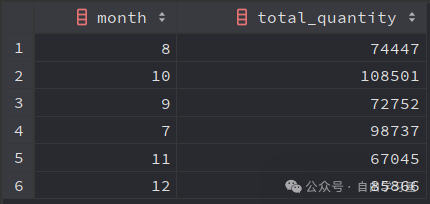 比如,使用前面虚拟销售数据集,我们可以计算每个月的总订单量: