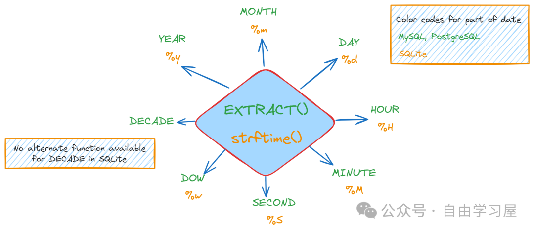 下图展示了最常提取的日期部分,以及你在使用EXTRACT函数时应该使用的关键字: