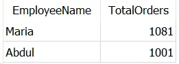 正如预期,它返回了处理的订单数量超过他们经理的员工——Abdul和Maria。