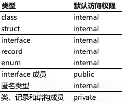 C#语言中如果声明时未使用访问修饰符关键,则都有默认的访问修饰符来限制访问,下表不同类型的默认访问。