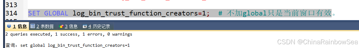 set global log_bin_trust_function_creators=1;    # 不加global只是当前窗口有效。