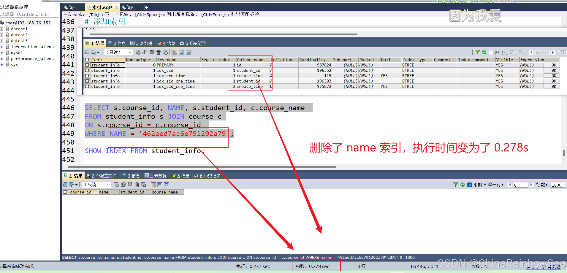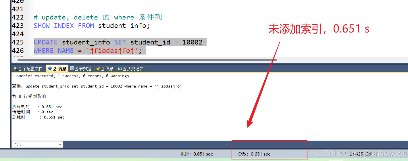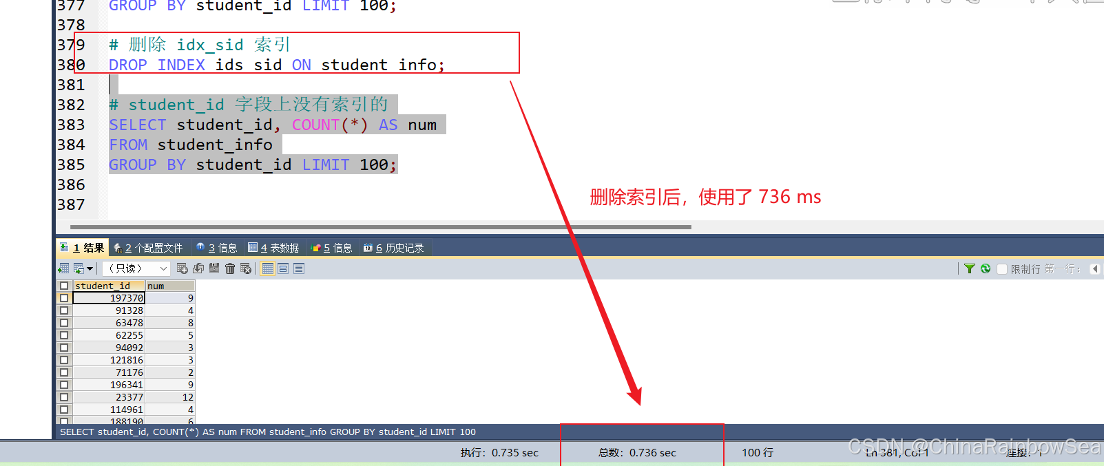 没有给 student_id 字段添加索引,执行的速度是: