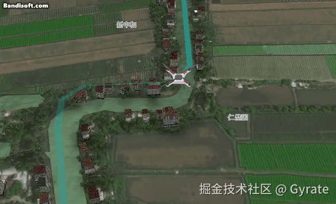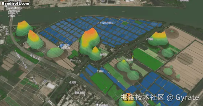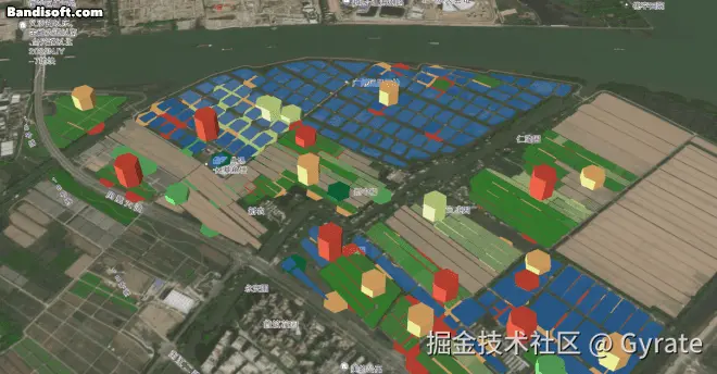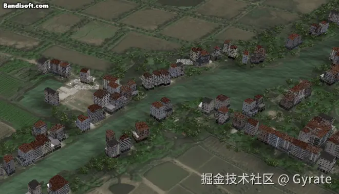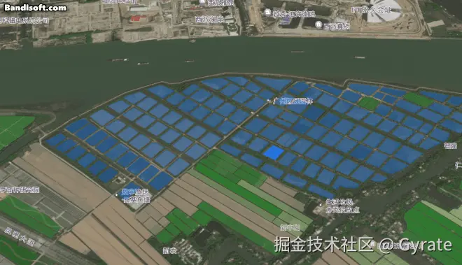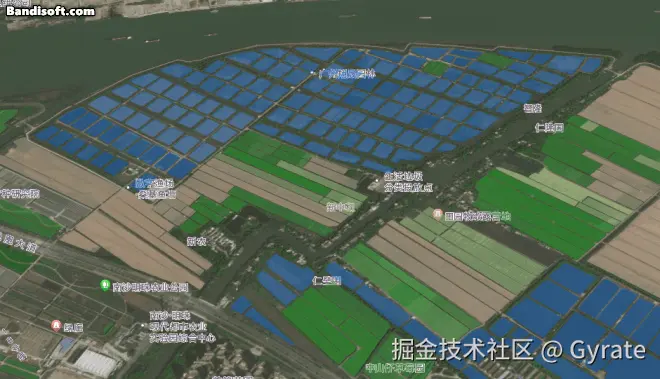 村居是指农业示范区内的建筑面生成模型,绿化图层则是绿树等植物的覆盖区域,原本应该是两个图层,因为在本场景中仅仅作为地图三维底座,均无交互性,我就直接把它们合并为一个3Dtiles以提升性能了。