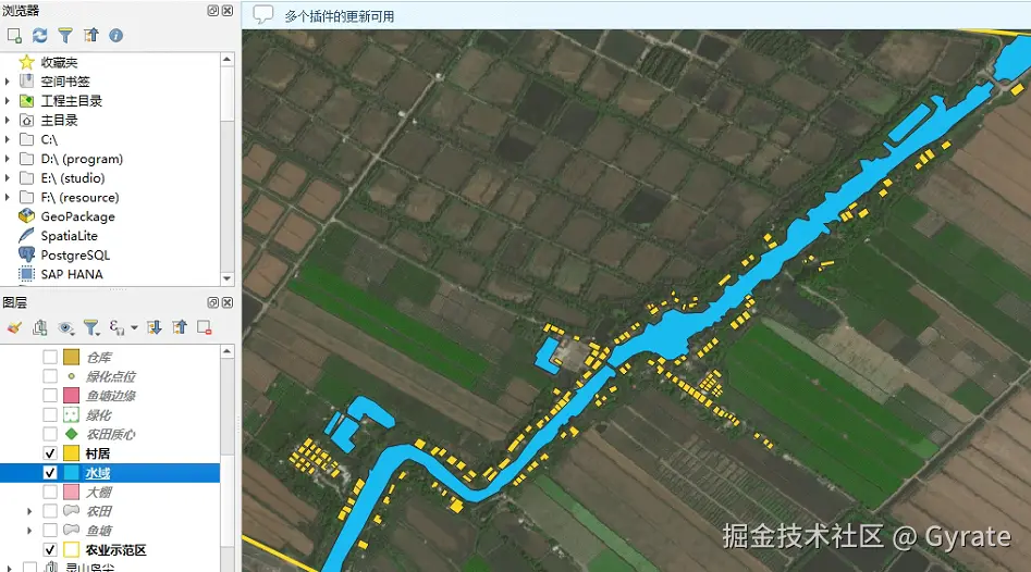 - 村居数据的建筑面获取方法有两种,我们可以通过一些GIS数据工具下载指定区域内建筑面数据,也可以通过AI Earth进行卫星影像图建筑物提取,最终生成geoJSON文件,导入QGIS进行数据清洗和加工。