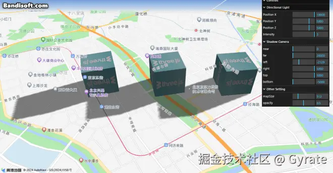 如何在高德地图的底图上添加模型的投影,我被困扰了一段时间,后来请教了高德的技术大佬WT才得到启发解开了这个问题,感谢wt大佬的支持。three.js提供了一种阴影材(ShadowMaterial)此材质可以接收阴影,但在其他方面完全透明。