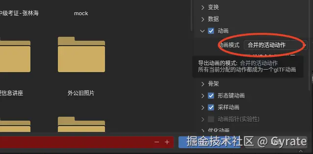 最关键的一步。导出gltf时动画一项必须勾选,且动画模式设置为“合并的活动动作”,这样的话,导出的gltf就能把所有部件动作合并为一个动作了。