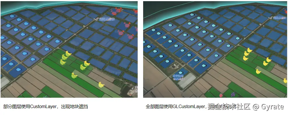 | 基础配套 | 卫星影像底图 | 图片 | 瓦片地图 | AMap.TileLayer | | 基础配套 | 村居建筑 | polygon | 三维建筑模型 | GlLayer.TilesLayer | | 基础配套 | 绿化区域 | point | 实例模型 | GlLayer.TilesLayer | | 基础配套 | 水域 | polygon | 水面多边形 | GlLayer.WaterLayer | | 农业生产 | 农田地块 | polygon | 带纹理多边形,可区分当前使用状态 | GlLayer.PolygonLayer | | 农业生产 | 鱼塘地块 | polygon | 带纹理多边形,可区分当前水体状态 | GlLayer.PolygonLayer | | 农业生产 | 农作物识别结果 | point | 作物类型点图标 | AMap.MassMarker | | 农业生产 | 农田灾害风险AI预测图 | point | 热力图 | Loca.HeatMapLayer | | 安全监管 | 区域边界 | polyline | 三维发光墙面体,如果有监控目标进入区域内则会出现告警 | GlLayer.BorderLayer | | 安全监管 | 无人机导航 | polyline | 无人机模型在空中飞行移动 | GlLayer.DrivingLayer | | 安全监管 | 巡查路线 | polyline | 无人机移动轨迹 | GlLayer.FlowlineLayer | | 安全监管 | 示范区服务点 | point | 带名称点标记,点击可切换到专属视角 | Loca.LabelsLayer | | 经济效益 | 产量AI预测图层 | point | 网格蜂窝柱状图,产量越大柱状越红且越高 | Loca.HexagonLayer |