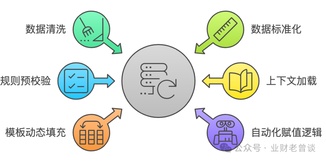 预处理:预处理有可能在接收源单调用,也可能是在生成目标单据时调用,目的是将单据转换生成所需信息补充完整,确保后续的单据转换步骤能顺利执行。包括数据清洗与标准化(比如前述中定义“【费用类型】”规则)、规则预校验(比如字段非空性验证、数据类型匹配(如金额是否为数值型))、上下文环境加载等。