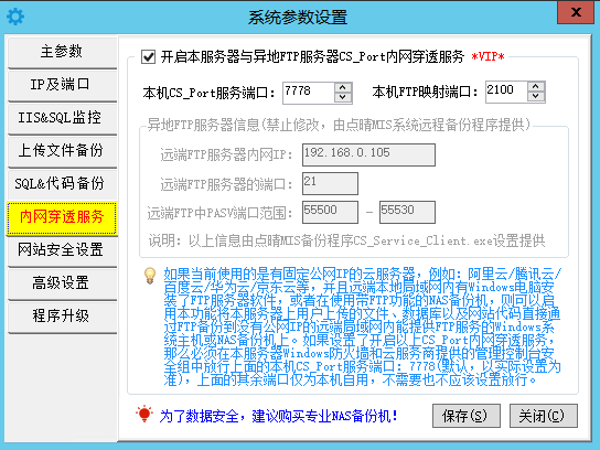 如果本单位购买了群晖之类的NAS备份机,而且群晖NAS机和点晴MIS服务器不在同一个局域网内,那么就可以勾选开启“启用内网穿透服务”。开启本功能之后,点晴MIS服务器上就可以直接访问到群晖NAS备份机了,然后在点晴MIS服务器上安装一个支持FTP备份的备份软件,然后设置将点晴MIS系统数据库、代码以及用户上传的文件直接通过FTP备份到群晖NAS机即可。