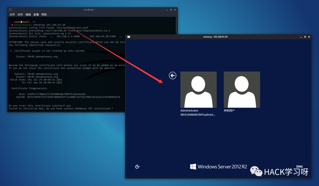 ![]() 然后启动远程桌面客户端 mstsc.exe 连接目标 Web 服务器 Windows Server 2012: ![]() 如上图所示,弹出了一个提示说 SocksOverRDP 成功启动,当服务端的可执行文件运行后即可在攻击机的 1080 端口上启动 SOCKS5 代理服务。 服务端远程桌面连接成功后,将服务端组件 SocksOverRDP-Server.exe 上传到 Windows Server 2012 上: ![]() 直接运行 SocksOverRDP-Server.exe 即可: ![]() 此时便成功搭建了一个 SOCKS5 代理隧道,查看攻击机 Windows 10 的端口连接状态发现已经建立连接: ![]() 然后在攻击机 Kali 上配置好 proxychains: ![]() 此时便可以通过代理访问到内网的主机 DC 了。如下所示,成功打开了 DC 的远程桌面:
