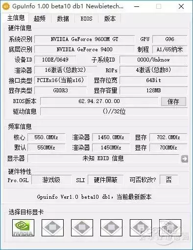 基于这个能力,针对nvidia的显示卡,Gpuinfo抛弃对PCI设备ID的依赖,退而使用自行建立的 NVIDIA 显示卡名称数据库,以 GPU 的真实型号作为基本依据来选择显示卡的名称。这是目前较为可靠的判定 NVIDIA 假卡的方式,所以测试一下无妨。