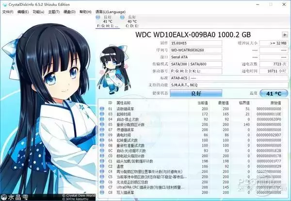 这里推荐的硬盘检测工具是CrystalDiskInfo5 Shizuku Edition,启动后,你会发现软件左侧出现了一个萌化的动漫角色,支持换肤哦,它还支持多个硬盘参数检测。