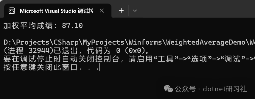 Console.WriteLine($"加权平均成绩:{weightedAverage:F2}");