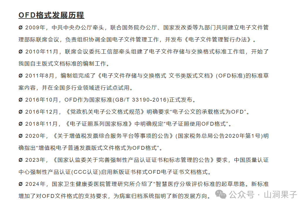 对于 OFD,也许你还很陌生,但它正广泛地运用在各种场合中(电子公文、电子证照、电子发票、电子档案等),比如税务局开具的发票格式,就逐步由原先的 PDF 替换为 OFD。 OFD(Open File Description)是一种电子文档格式,它由中国电子技术标准化研究院(CESI)主导制定,旨在解决当前电子文档格式众多、互不兼容的问题。OFD格式的目标是成为一种开放、中立、安全、可控的电子文档格式标准,类似于PDF在国际上的地位。(1)国家标准版式文档格式,自主知识产权,自主可控;(3)支持国产加密算法,具有全面的安全保障体系,可防止信息被盗取,并且和数字签名技术结合,可防篡改抵赖,更加安全;(4)永久可读可用,可对文件长久保存,且可以精准呈现,文件的版式内容在不同场景、设备下都能保持一致性;(5)呈现效果与设备无关,在各种设备上阅读、打印或印刷时,版面固定、不跑版。OFD:在国内政府机关、国有企业等领域得到了大力推广和应用。例如,国家电子政务系统中,很多公文、档案等都采用 OFD 格式进行存储和传输,以确保文档的规范性和安全性。 PDF是由Adobe公司开发的一种用于呈现和交换文档的文件格式。它被广泛应用于各种领域,具有跨平台、保真度高、可读性强等特点。PDF可以在几乎所有操作系统和设备上打开,并且文档的格式在不同平台下保持一致。 OFD格式与PDF有着不同的文件结构和功能特性。OFD采用XML描述文件结构,更适合金融领域应用,支持数字签名、动态效果和互联网链接。相比之下,PDF更注重文档原貌保持,跨平台兼容性强,但在动态效果和链接方面略显不足。