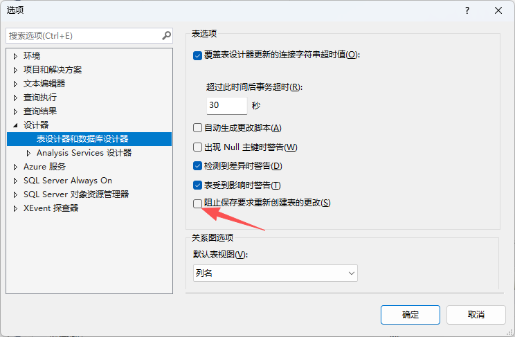 问题描述 在 SQL Server 2014 中,创建好表之后,想重新设计一下表的结构,出现以下问题: 不允许保存更改。您所做的更改要求删除并重新创建以下表。您对无法重新创建的表进行了更改或者启用了“阻止保存要求重新创建表的更改“选项。 ![]() 解决步骤 打开 SQL Server 2014 Management Studio 并登录,登陆后在菜单栏中按照「工具->选项->设计器->表设计器和数据库设计器」次序点击鼠标,直至出现下图: 然后将红框处的「阻止保存要求重新创建表的更改」内容取消打 √,如下图所示; ![]() 确定后保存。 之后就可以愉快的更改表了。 该文章在 2025/9/3 17:32:51 编辑过 |