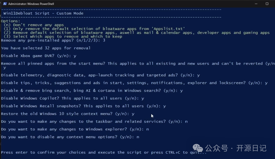 1. 打开以管理员身份运行的 PowerShell。2. 输入下面的命令,按 Enter:& ([scriptblock]::Create((irm "https://debloat.raphi.re/")))