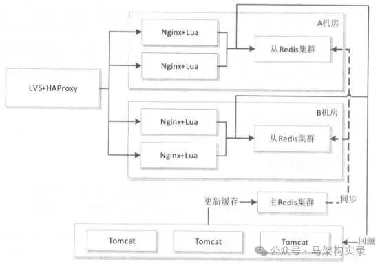第一步先读取Redis集群。如果不命中,则回源到Tomcat集群(其会调用数据库、服务总线获取相关数据) 来获取相关数据。redis集群会进行多机房主从同步,各自机房读取自己机房的从redis集群,如 下图所示。