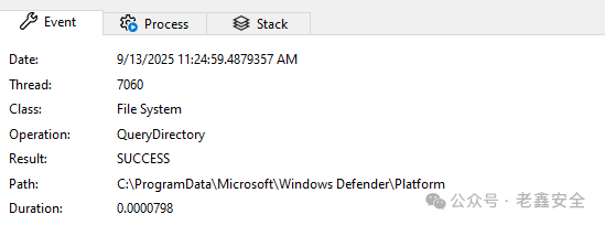 假如这是典型杀毒软件磁盘扫描功能中的一个代码片段——它获取文件路径,使用恶意软件特征库检测该文件数据,若发现有问题则删除该文件。 恶意程序可以创建一个文件,填入特定杀毒引擎能检测到的字节(例如,写入 EICAR 字符串),通过某种方式触发杀毒扫描(比如尝试读取该文件以触发实时防护扫描),随后迅速将该文件替换为指向其他文件的符号链接。 这就形成了众所周知的条件竞争:is_infected_file()处理的是一个文件,但remove_file()可能会处理另一个文件!路径虽然相同,但在这两个函数中指向了不同文件:一个是检测到有问题的常规文件,另一个是指向他处的符号链接。 So,remove_file()将删除符号链接指向的目标(该目标可由攻击者指定)。如果这个目标是杀毒软件自身的EXE,那么就会发生以下这种搞笑事情 比如有一个以NT AUTHORITY\SYSTEM身份运行的杀毒服务。黑客在设备磁盘上放置恶意的EICAR测试文件,随后开始循环检查文件的最后访问时间戳”,试图检测其文件是否被访问。当杀毒软件访问该文件并识别出恶意内容后,尝试将其从磁盘删除。然而就在此时,黑客将其文件替换为符号链接——该链接通过结合NTFS挂载点与对象管理器符号链接,最终指向杀毒软件自身的核心文件。如此一来,杀毒软件便完成了自我删除的窒息操作 见上图,存在任意文件删除漏洞的安全产品可不少呢,虽然很多都已经修复勒无法复现。但别担心,兄弟,软柿子始终都是有的,经过测试还有很多存在这种漏洞,为了避免风险,这里以Windows Defender为例...... 实战案例:Windows Defender的符号链接攻击每当有新版本更新时,WinDefend服务都会创建一个以新下载的版本命名的新文件夹,并将其放置在“ C:\ProgramData\Microsoft\Windows Defender\Platform ”文件夹中。新文件夹包含新版WinDefender的所有可执行文件。 当 Windows Defender 从旧版本过渡到新版本时会发生什么 ?