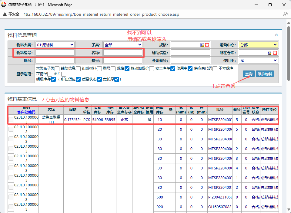 ![]() ![]() 1.进入ERP系统之后,在左侧功能菜单里找到“BOE定制”,点击“正常加工”,找到“新增原材发产线出库”。 2.进入界面之后,按图操作,选择好发货仓库(备注的话根据情况填写)。 3.接着在界面中填写“物料编码”,点击编码会弹出物料信息窗口。 在弹出的物料信息窗口里,找到对应的原材料信息,然后点击查询(找不到可以用编码或名称筛选),点击对应的物料信息。 4.然后确认无误后,根据情况选择“提交制单待出库”或者“提交立即出库”。