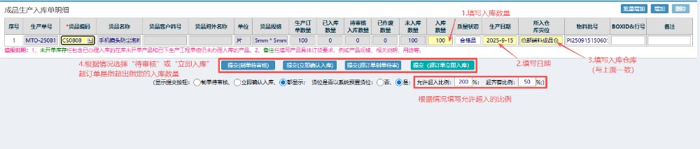 ![]() ![]() 1.进入ERP系统之后,点击“BOE定制”,点开“正常加工”,然后找到“新增成品生产入库单”。 2.进入界面后,按图操作:选择好对应入库仓库。备注可根据情况填写。 3.接着点击下方的“货品编码”,会弹出物料的信息界面。 弹出界面后,按图操作:选择订单来源,然后点击查询,点击对应的物料信息。 如果找不到可根据代码或名称筛选。 4.选好物料后,按图操作:填写入库数量、日期以及入库仓库(与上面一致)。 根据情况选择“待审核”或者“立即入库”。如果有超入的情况下,需要设置好超入的比例。 超入:指超出入库订单指定的数量。 5.提交之后,回到左侧功能菜单,点击“成品入库单管理”。 6.点击进入后,按图操作:选择订单大类,是否是超入的订单,然后点击查询(找不到可以根据代码或名称筛选)。