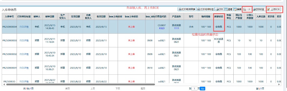 7.接下来就是进行入库的操作:先入库,再上传BOE。同时检查下成品的质量状态。 流程结束。 备注:如果成品质量状态为“BOE材损品”,接下来的流程跳转到这里: 点晴ERP-BOE材损原材转换流程