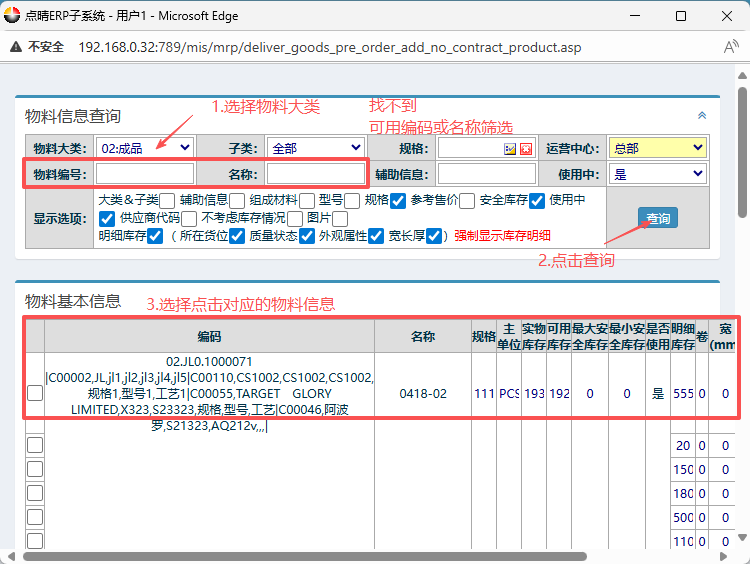 3.接下来就是点击“货品编码”,会弹出物料信息界面。 弹出界面之后,先选择物料大类,然后点击查询(找不到可用编码或名称筛选),再点击选择对应的物料信息。 4.选好物料后,按图操作:填写好发货数量和发货单价,有多物料需求的可以增加,没有就无视。最后提交审核。 5.提交审核之后,回到左侧功能菜单里找到“成品送货单管理”。 6.进入界面后,按图操作:点击选择收货客户,然后再点击查询。 ![]() 7.查询后,下方会显示所有的出库单,根据出库类型:出库预订单进行查找,点击对应送货单,点击发货。