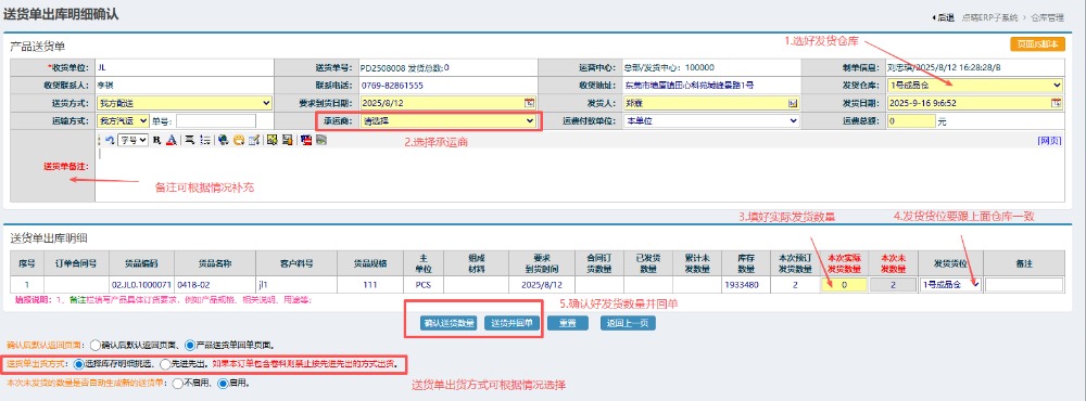 进入发货界面,按图操作:选好发货仓库以及承运商,备注根据情况补充。然后填好实际发货数量,发货货位要跟上面仓库一致,最后确认发货并回单。 注:送货单出货方式可根据情况进行选择 8.发货和回单之后,确认当前单据类型为出库订单,然后点击上传BOE。