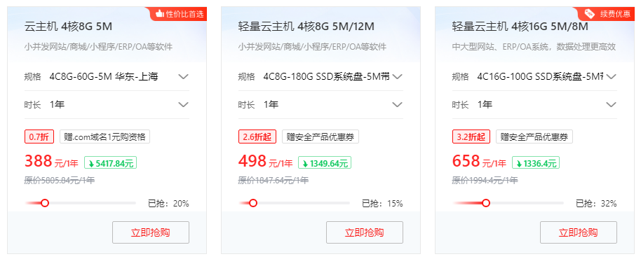 小技巧:购买后立即续费一年,可锁定当前价格,避免后续调价。 活动地址:https://t.aliyun.com/U/hekmId 二、腾讯云 —— 三年套餐闭眼入,真香警告 腾讯云近年来在配置和价格上持续加码,尤其三年期套餐,年均成本不到200元,带宽充足、性能稳定,非常适合打算长期运营项目的用户。 轻量服务器 2核4G + 6M带宽 + 50GB SSD 轻量服务器 4核4G + 3M带宽 腾讯云轻量应用服务器,界面简洁、功能齐全,三年合约锁定低价,是追求性价比用户的理想选择。 活动地址:https://curl.qcloud.com/To20faTS 三、京东云 —— 低价入门首选,新手友好 京东云近年发力迅猛,价格极具竞争力,特别适合刚接触云计算的新手,或者想低成本试水项目的开发者。 云主机 CVM 2核2G 轻量服务器 2核4G + 5M带宽 云主机 CVM 2核4G 京东云控制台简洁直观,客服响应迅速,适合追求“省心+省钱”的用户群体。 限时抢购地址:https://3.cn/2-i5UbPc 四、其他高性价比备选(新老用户均可关注) 除三大主流云厂商外,以下几家也提供极具吸引力的优惠方案,尤其适合有特定需求的用户: 百度智能云 华为云 优刻得 UCloud 五、选购建议与注意事项 新用户建议优先考虑阿里云或腾讯云,首年优惠力度最大,配套资源丰富。 如计划长期使用,优先选择支持“续费同价”或“三年期套餐”的产品,避免后续成本飙升。 若项目紧急上线或面向海外用户,可考虑优刻得免备案专区,节省时间成本。 企业级项目建议从2核4G起步,带宽不低于3M,确保访问流畅和业务稳定。 下单后如支持“立即续费锁定价格”,建议第一时间操作,防止活动结束或价格回调。 最后提醒 云服务器促销活动更新频繁,部分特价库存有限,随时可能下架。 欢迎收藏本文,也推荐转发给有需要的朋友,一起节省上云成本。 各平台活动直达链接: 阿里云:https://t.aliyun.com/U/hekmId 2025年,低成本也能实现云端自由。 阅读原文:原文链接 该文章在 2025/9/18 12:23:48 编辑过 |